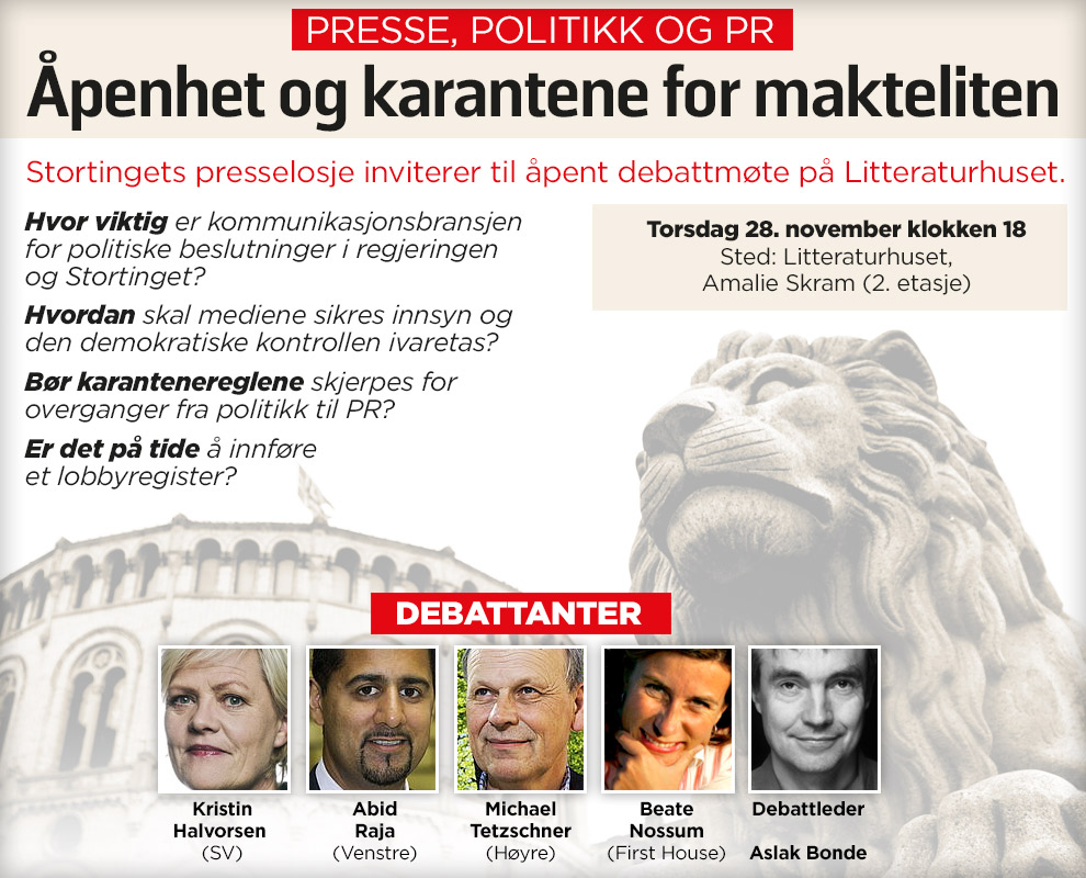 I panelet sitter Beate Nossum fra First House, Kristin Halvorsen fra SV, Abid Raja fra Venstre og Michael Tetzschner fra Høyre. Debattleder er Aslak Bonde. Det åpne møtet med tittelen "Åpenhet og karantene for makteliten" finner sted på Litteraturhuset kl 18 torsdag 28. november.
